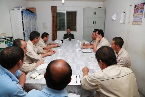 聽取匯報后,鄔清富局長首先代表工程局、局黨委向戰(zhàn)斗在遙遠的異國他鄉(xiāng)的廣大職工和配屬人員表示親切慰問。他對TP項目部前期的工作給予充分肯定,同時,就今后的工作向項目部提出了三點要求:1、狠抓安全、質(zhì)量、進度、環(huán)保工作,注意安全生產(chǎn),不能麻痹大意,進一步提高砼質(zhì)量及外觀工藝,倒排工期,確保在2015年12月底合同工期內(nèi)順利完工;2、認真研究合同,準備資料,抓好結(jié)算;3、加強項目管理,加強人、材、物的管理,及時總結(jié)涉外施工管理經(jīng)驗。最后,鄔局長要求項目部、局工會要大力宣傳職工的愛崗敬業(yè)奉獻精神,進一步關(guān)心涉外職工生活,努力幫助解決實際困難,切實讓職工感受到組織的關(guān)懷。